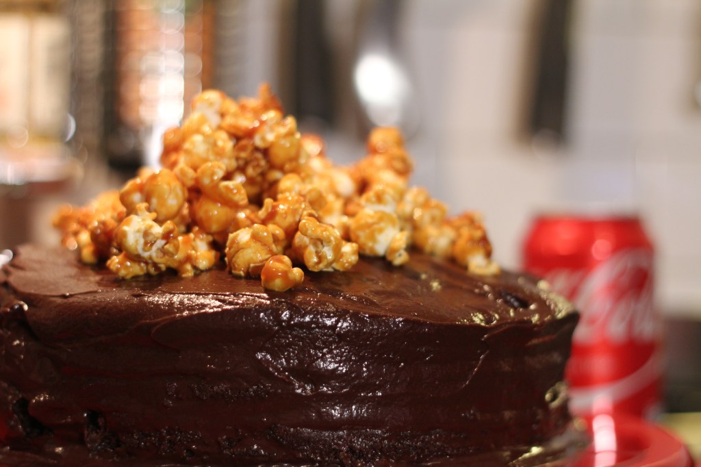 This is my version of Oscar night Cake. Pop corn and Coke for the traditional movie night atmosphere and the golden caramel looks like the statue itself. This cake stood well up to the occasion!